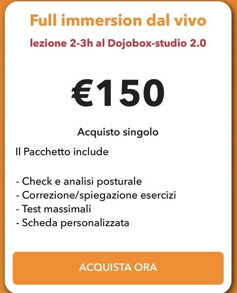 L'allenamento dal vivo presso il Dojobox-Studio 2.0 consiste invece in una lezione di 2-3 ore in cui lavorare e migliorare la tecnica degli esercizi, per poi compilare una scheda mensile in diretta, totalmente ricamata addosso a te. Il costo è di 150,00€.
